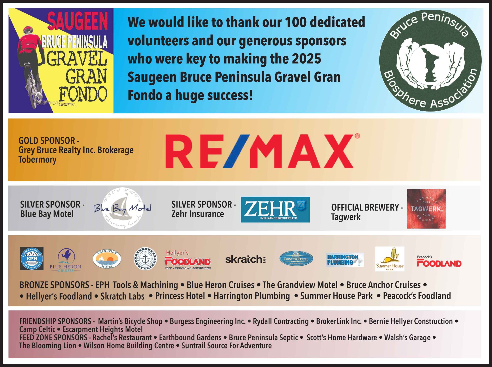 On October 5th, the scenic routes of the Saugeen Bruce Peninsula had more than 400 cyclists riding with huge smiles while actively fundraising for a good cause. Cycling on this spectacular, warm, sunny day with its stunning landscapes and challenging terrain, showcased not only the beauty of the area but also raised an impressive $67,000. The Fondo is by far our largest fundraiser of the year! The BPBA will use these funds and the other fundraising activities, including a 50/50 draw and merchandise sales, to enhance local conservation projects, community education programs, and initiatives that aim to protect the area’s unique biodiversity, improve water quality and keep our dark skies dark! A team of 100 passionate volunteers dedicate their time and effort to ensure the event runs smoothly. From setting up food and water stations to managing the start and finish lines, volunteers play a crucial role in creating an unforgettable experience for participants. The grassroots nature of the event highlights the growing interest in gravel biking and the vibrant cycling community on the Peninsula. The race offered participants a choice of four different routes -115, 80, 56, and 30 km - each presenting unique challenges and breathtaking views. Riders navigate through a mix of gravel roads and picturesque trails, taking in the stunning fall foliage and the natural beauty that the Peninsula is renowned for. Our sponsors play a vital role in the success of the event. Thank you to everyone involved! Also, special thanks to the many photographers who captured the event. Learn more and mark your calendar for next year's event, being held Oct 4th, 2026. Visit our website for details. Registration will open in early 2026: brucegravelfondo.com/.